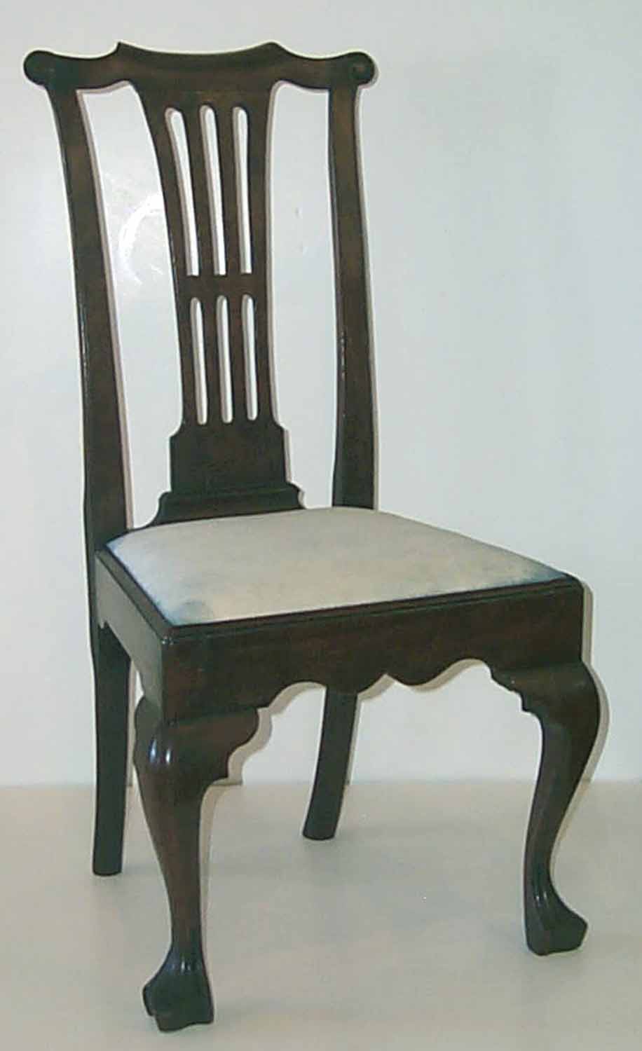 This assembled pair or side chairs were certainly made in the same shop and it is possible, originated in the same set. They are virtually identical in every aspect of construction and dimensions with only the most minor variations that are common within any set of chairs of the period. However similar, they must be considered an “assembled” pair in light of their different histories. The serpentine crest rail with scrolled ears, cabriole legs terminating in carved trifed feet, stump rear legs and the shaped seat rails all point to an urban Philadelphia shop. Both the feet and ears are stylistic details that can be related to Irish prototypes and reflect the influence of Irish traditions in Philadelphia (and some Virginia) furniture.