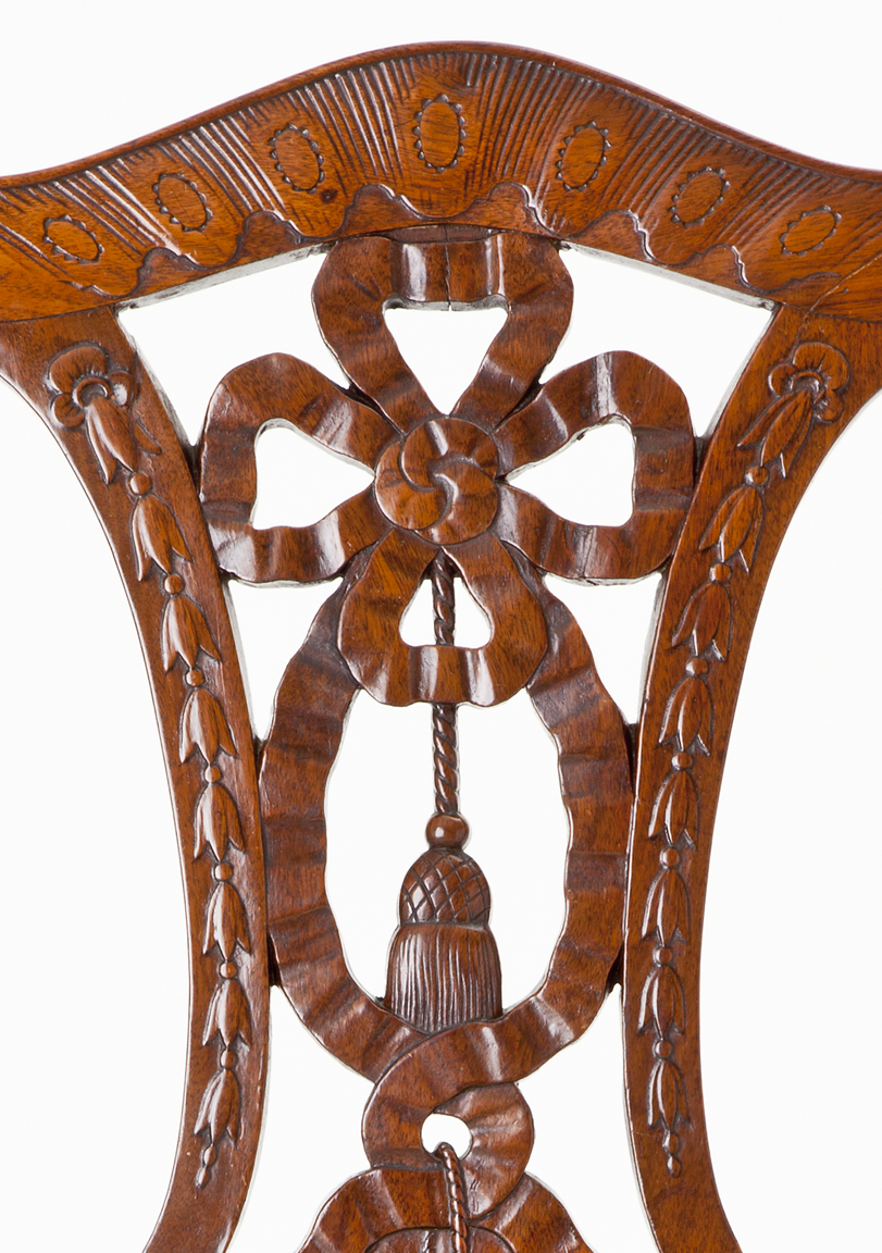Attributed to the shop of General Stephen Badlam, Dorchester Lower Mills, Massachusetts, c. 1780-1790, the elaborate carvings adorning the splats, crest rails and medallions of these chairs represent the very finest work of a master craftsman. The floral chains, intricate bowknot, bold tassels, bellflower pendants and intertwined motifs incorporated on the central medallion articulate decorative themes drawn from Chippendale as well as the emerging neo classical style of the Federal period. These chairs are among the best conceived by Badlam or his contemporaries, “known for producing furniture of great opulence” and were without doubt commissioned by one of the period’s most prominent patrons. A related chair from the collection of the Art Institute of Chicago is pictured in “Carving an American Style” (page 58) by Dean Lahikainen. One of our pair was exhibited in “A Bit of Vanity, Furniture of Eighteenth Century Boston” 1972. Provenance: Israel Sack.