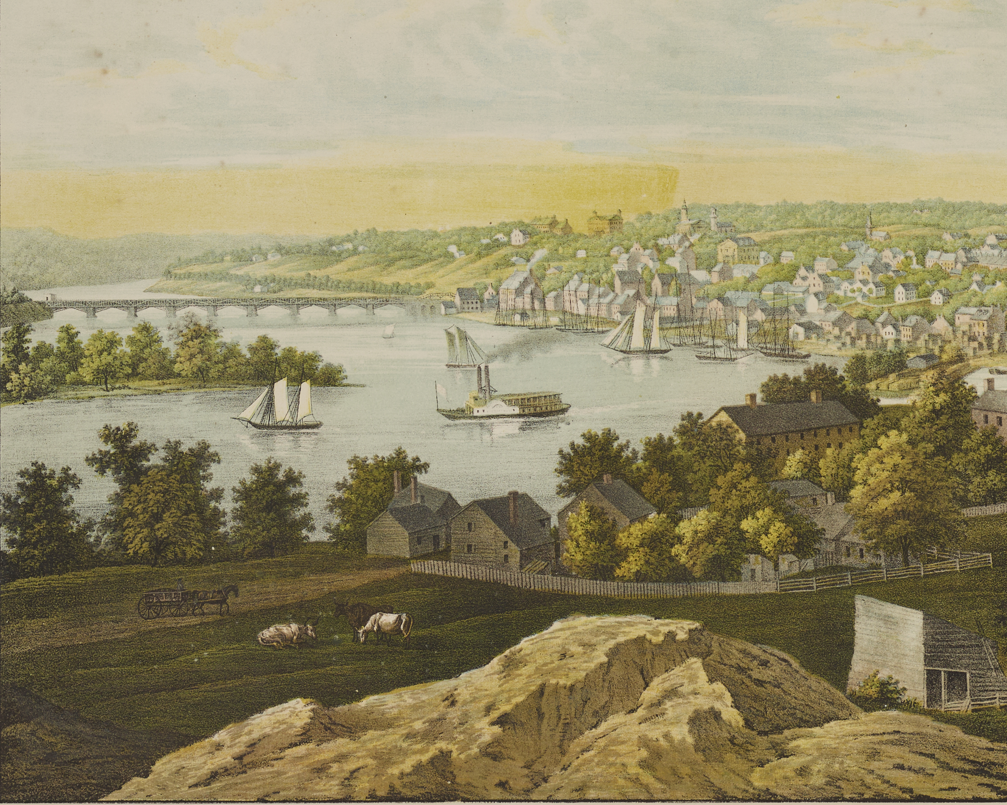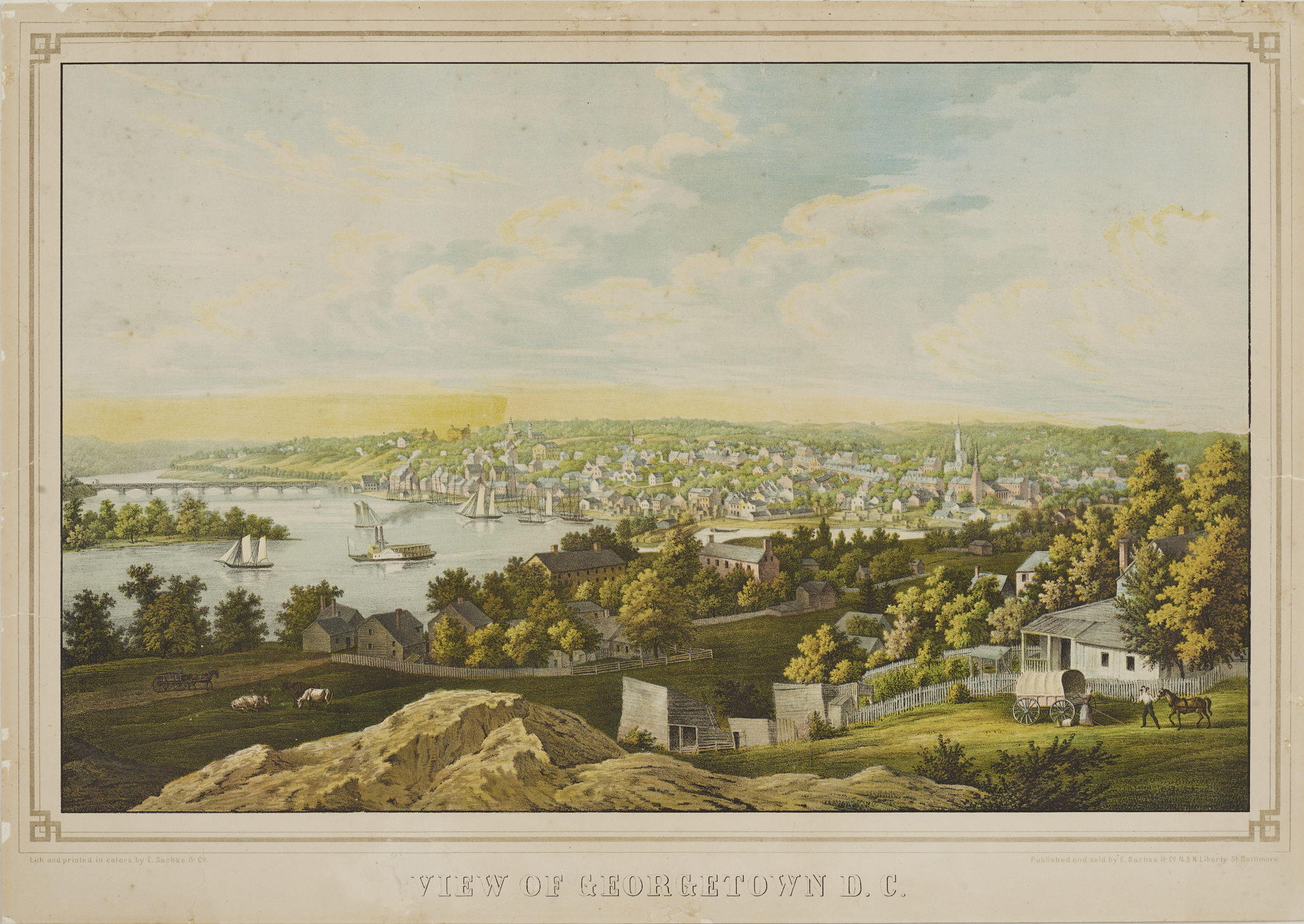 Taken from the hill top site of the old Naval Observatory, this view of the Potomac River and Georgetown is the finest delineation of the bustling Potomac riverfront of the era. It exhibits Sachse’s initial artistic style which would evolve into the popular “bird’s eye” view perspective in his later prints. It is extremely rare with only three other (non facsimile) copies recorded. (Library of Congress, Georgetown University Library, Penn State University) The Sachse firm, based in Baltimore, was among the first and foremost printers to adopt and master the relatively new chromolithographic technique and produce high quality color views of American towns and cities. Sachse focused primarily on views of Baltimore, Maryland and Washington DC.
