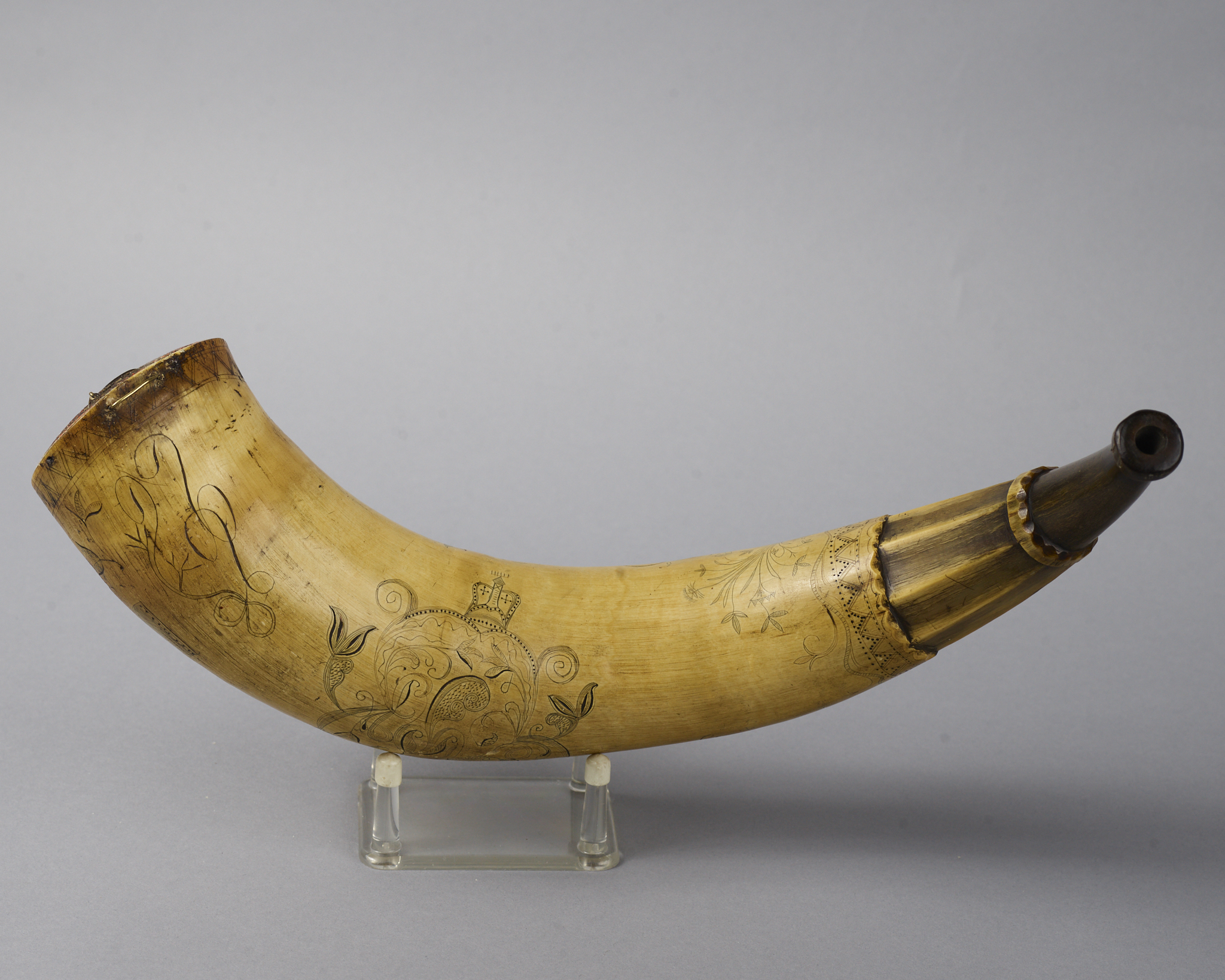 Elaborately carved horn with a fanciful illustration of St. James church (rebuilding completed 1787)
