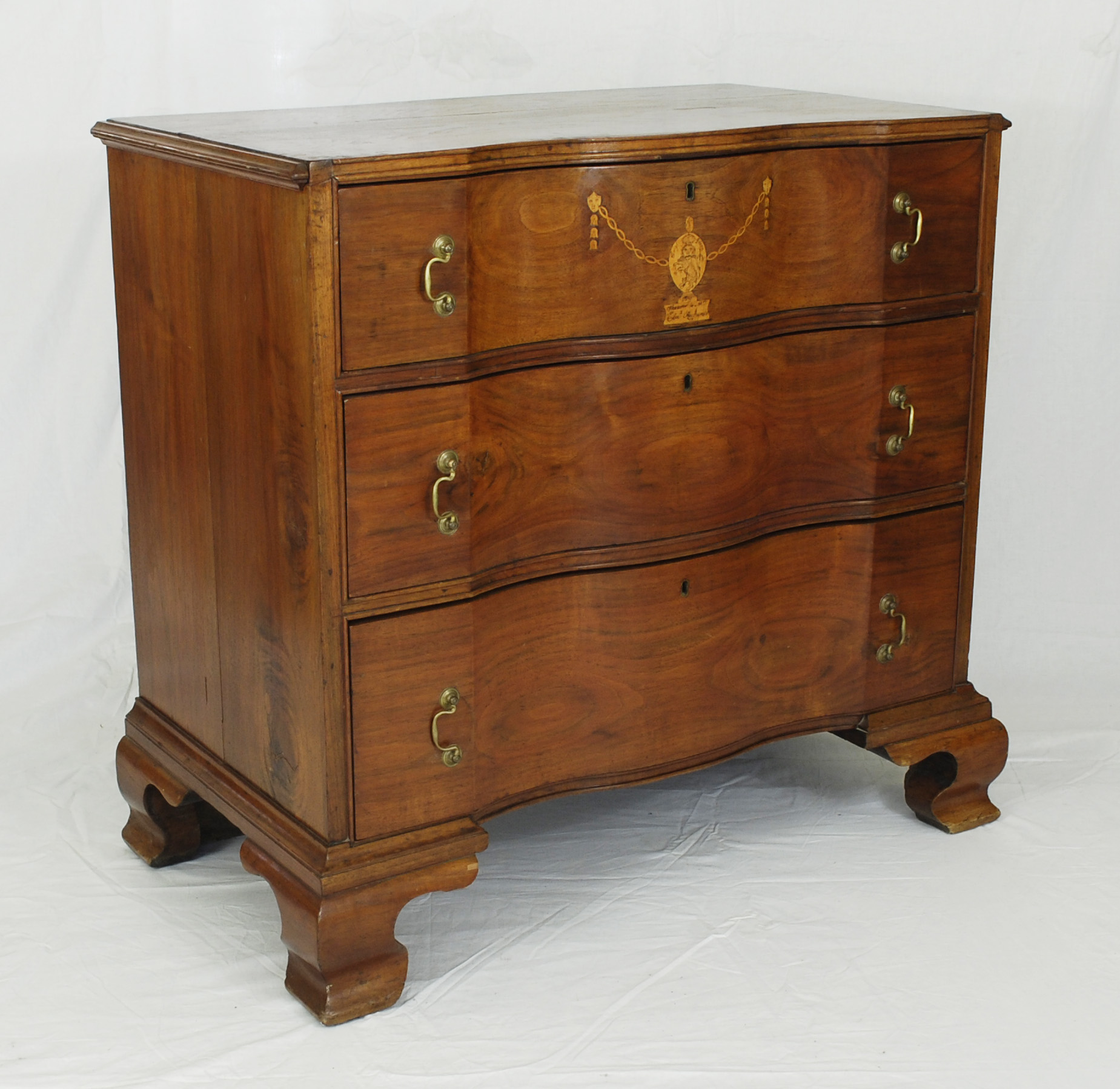 According to Elizabeth Davison, author of The Furniture of John Shearer 1790-1829, this chest contains four of cabinetmaker John Shearer’s signature elements: a serpentine façade with blocked ends, vertical pulls, unconventional top and bottom moldings and swelled bracket feet. Although the elusive Shearer is usually thought of as a Berkeley County (now West Virginia) resident, it appears he spent some time in Loudoun County Virginia from about 1810 to about 1818. This chest of drawers was made during that time for a Mrs. Elizabeth Richards.