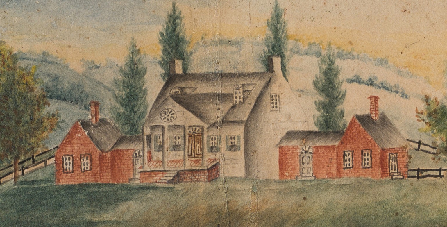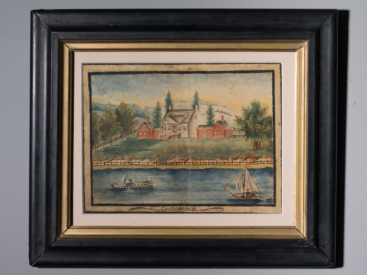 This painting is a delightful portrait of a very early house on the Maryland side of the Potomac River across from Alexandria VA. The portrait, circa 1825, depicts a prosperous and well-kept plantation house with a center block that dates to the mid-18th century with later symmetrical brick additions connected by hyphens. The house faces the river, where there are an early steamboat and a sailing skiff passing by, underlining the importance of water transport in the period. There were commercial steamboats operating on the Potomac as early as 1813, transporting goods and people to the ports of Georgetown and Alexandria.