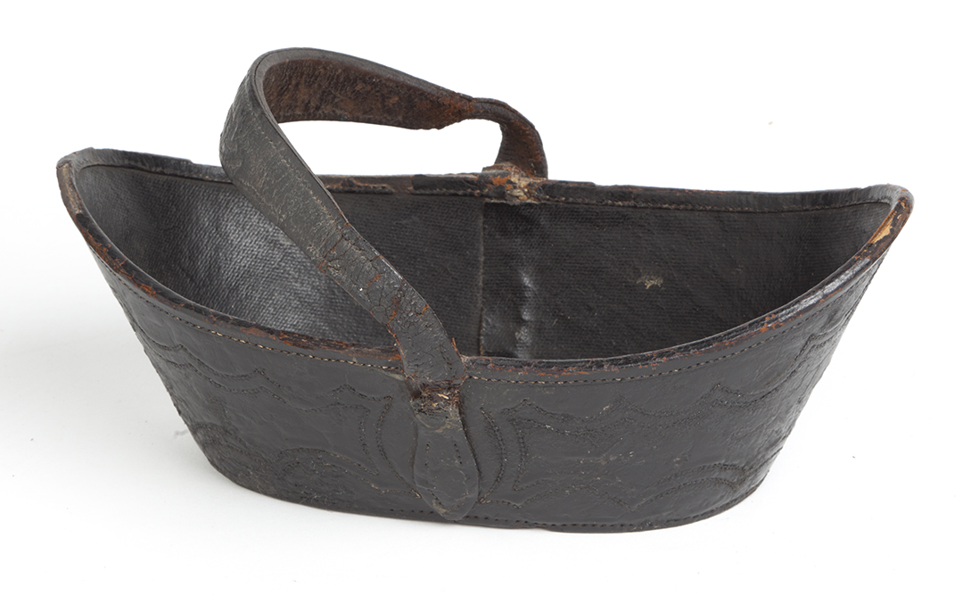 Key baskets seem to have been a unique product of Virginia and North Carolina with the majority of surviving examples having origins in or around Richmond. While a significant number of examples, many of fine quality, have appeared since R. Lewis Wright’s article in the May 1982 Journal of Early Southern Decorative Arts, little additional information has surfaced regarding the origins of the form or its use. Some key baskets were made and marked by established harness and saddle makers such as the Cottrell family of Richmond but the majority seem to have been the product of individual leather workers and were probably unique creations produced for specific clients and occasions. The key basket served both a practical and symbolic role in the southern household. At one level the basket was a simple and convenient conveyance for the multiple keys needed for the locks securing sugar chests, cellarets smoke houses where valuables were stored. At another, the key basket represented the authority and responsibility of the lady of the house who presided over the range of service staff, slaves and operations necessary for the smooth functioning of a couple’s domestic arrangements.