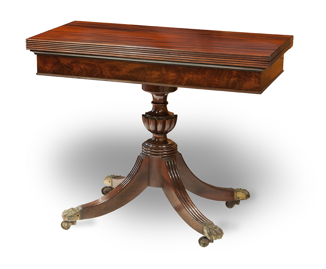 Commentary:    Card tables were a staple of Baltimore’s cabinet shops. This table with its pointed reeding, bold urn shaped vase and multiple ring turned shaft set on sabre legs is quite characteristic of the style popular in Baltimore in the first quarter of the nineteenth century.  Similar tables have been attributed to the shop of William Camp and Anthony Jenkins who were among the city’s most prominent cabinetmakers during the period 1800-1825. A mahogany writing table in the collection of the Maryland Historical Society with a similar has been attributed to the hand of William Camp while a nearly identical card table at the Baltimore Museum is attributed to Jenkins.