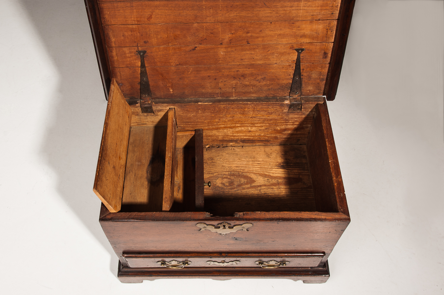 A miniature walnut blanket chest from the Piedmont of Virginia with a lower drawer and interior till and additional storage drawer. A finely constructed box, with half blind dovetails on the front corners and full dovetails on the rear. The interior retains the original iron strap hinges, a till with the original lid, and a fully dovetailed drawer below. Below the main storage section is a full width drawer with a carved, molded edge, rosehead nails securing the bottom and original brass handles and escutcheon. The applied molded base is dovetailed, with ogee bracket feet and a central drop. Mellow early surface. Sturdily built miniature chest with the same proportions as its full sized cousins.