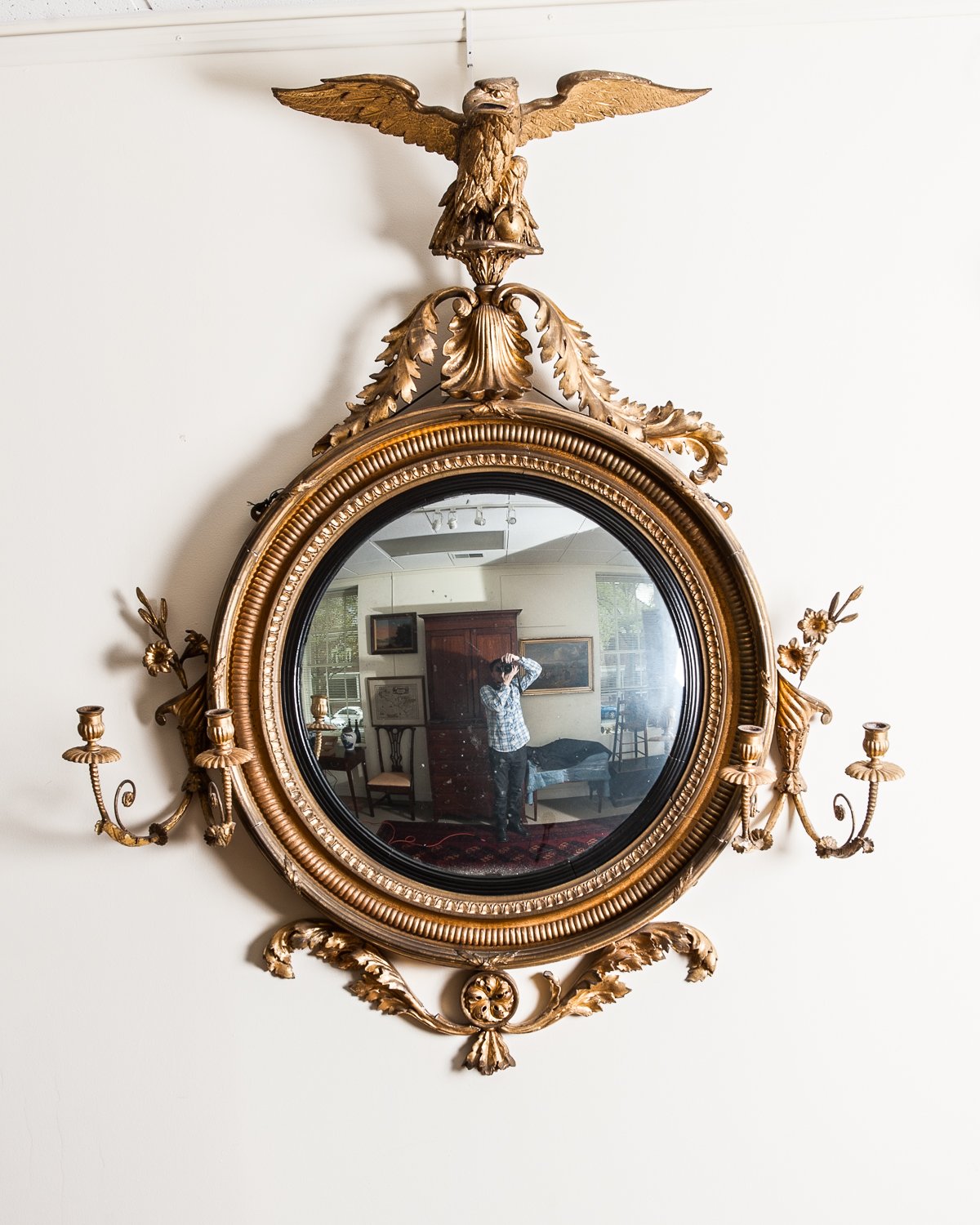 This example is among the most elaborate of the period glasses. The glass is surrounded by a triple molding: a reeded and ebonized slip, a carved egg and dart middle molding and an applied gadrooned circle set in a deep cove molding further embellished with applied foliage. Flanking the glass is a pair of double sconces held by carved cornucopias. The glass is surmounted by a spread winged eagle resting on a pedestal with one claw gripping a sphere. The pedestal is supported by trailing acanthus leaves. The grouping of formal foliage at the base balances the eagle above.