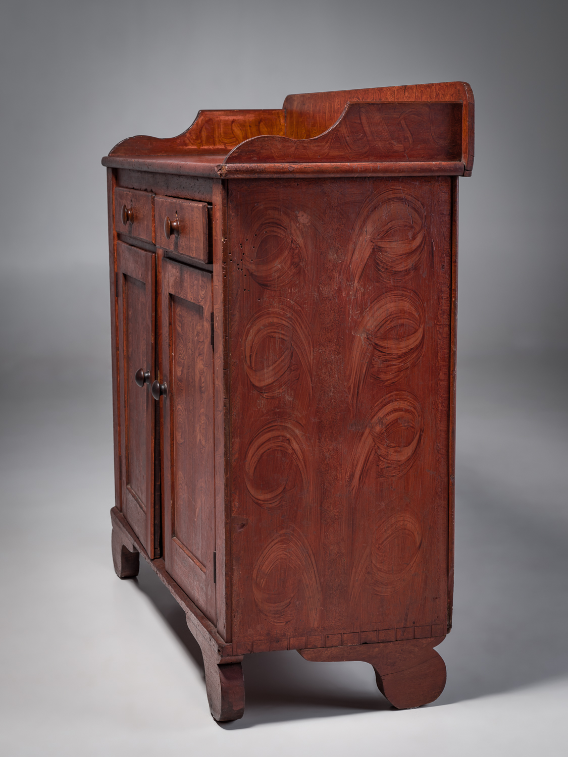 Original fanciful woodgraining over a poplar cupboard with unusual feet.