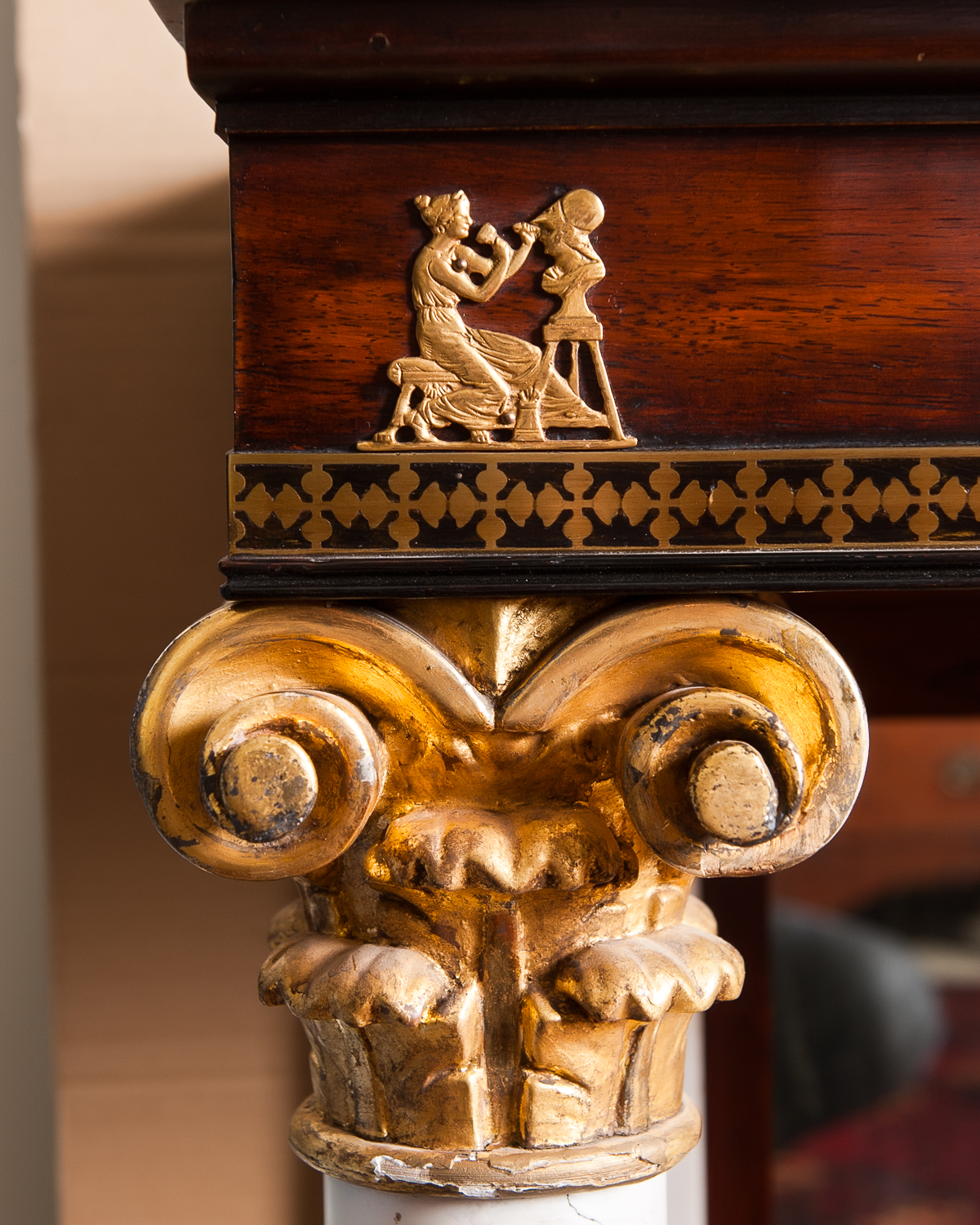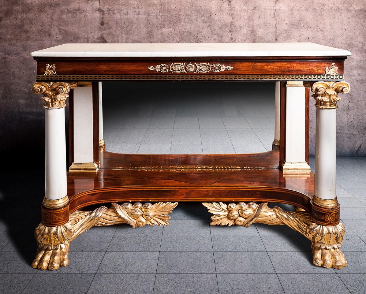 This imposing pier table is virtually identical to other furniture attributed to the shop of Joseph Meeks (1771-1868) of New York, including two examples in the Metropolitan Museum. Meeks and his son John operated a furniture manufactory and showroom in New York and shipped furniture to their regional showrooms and warehouses in Savannah and New Orleans, taking advantage of the growing urbanization and sophistication of the southern furniture market.