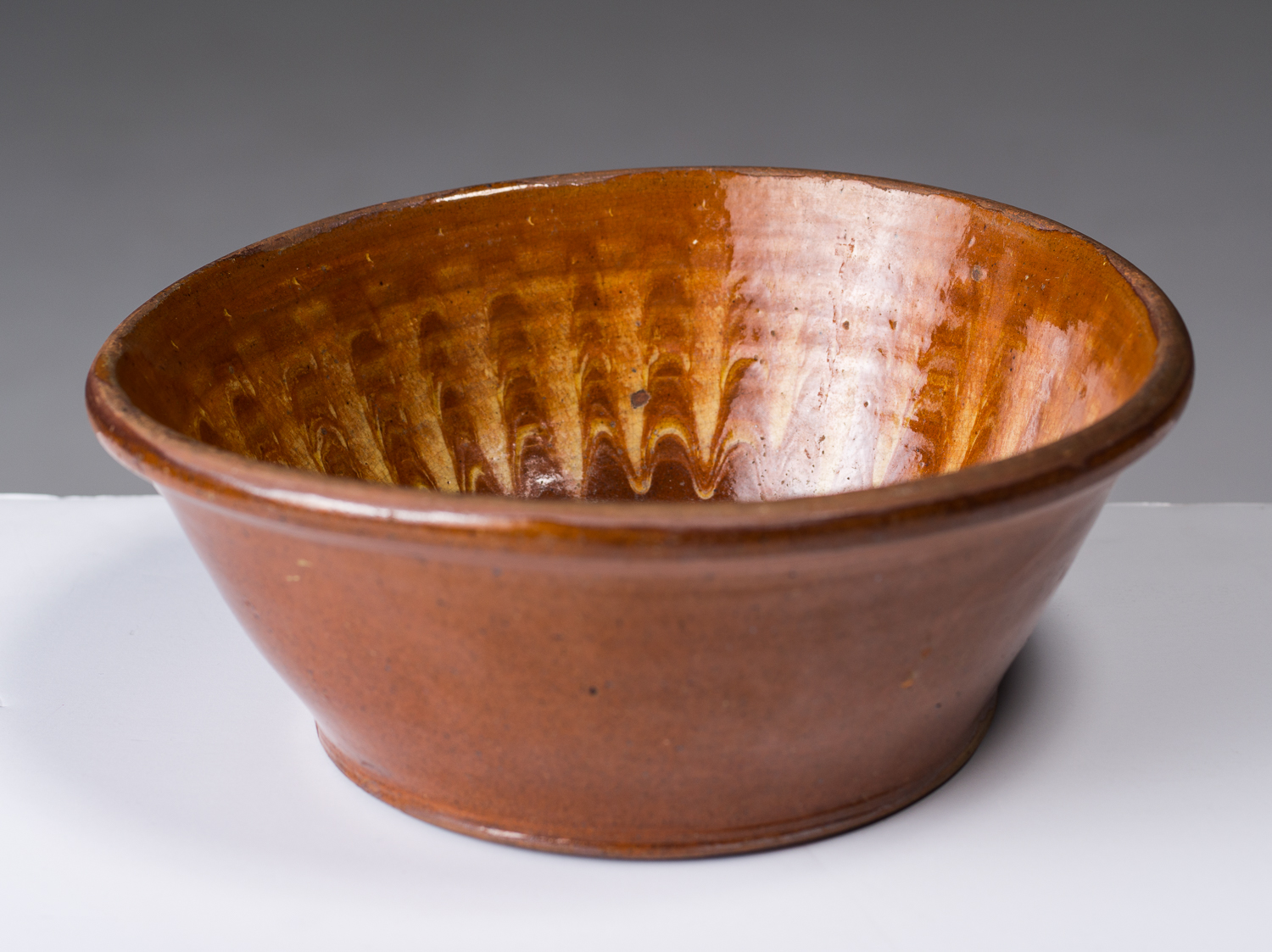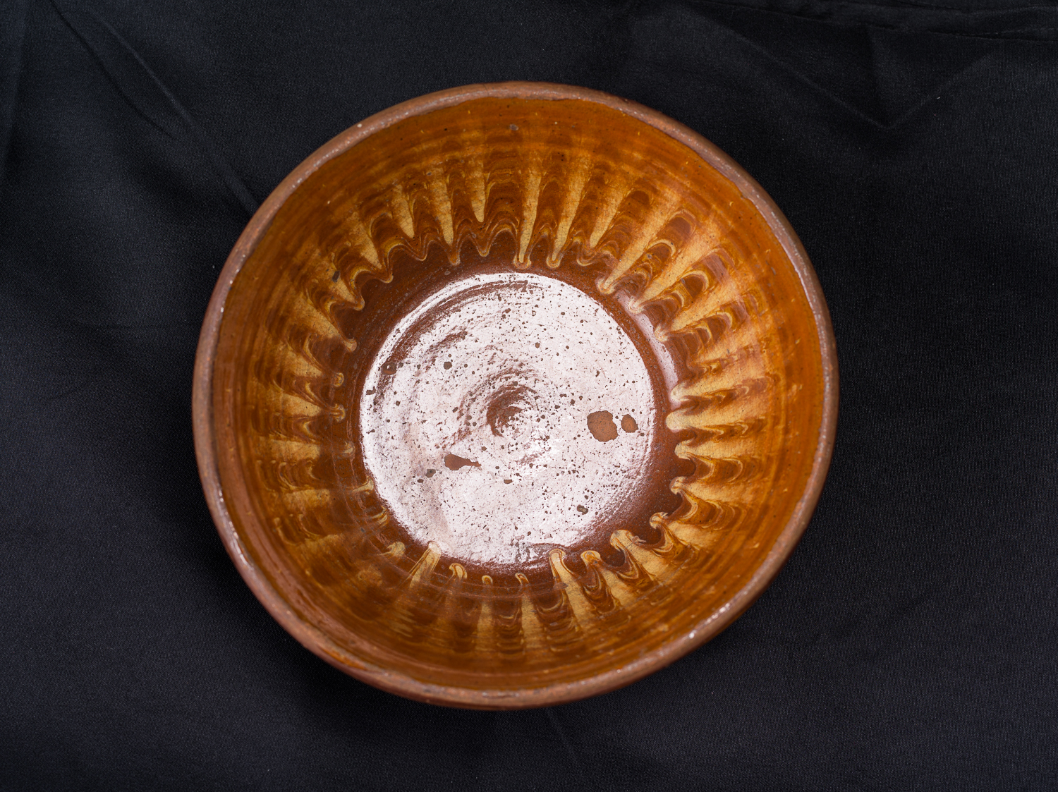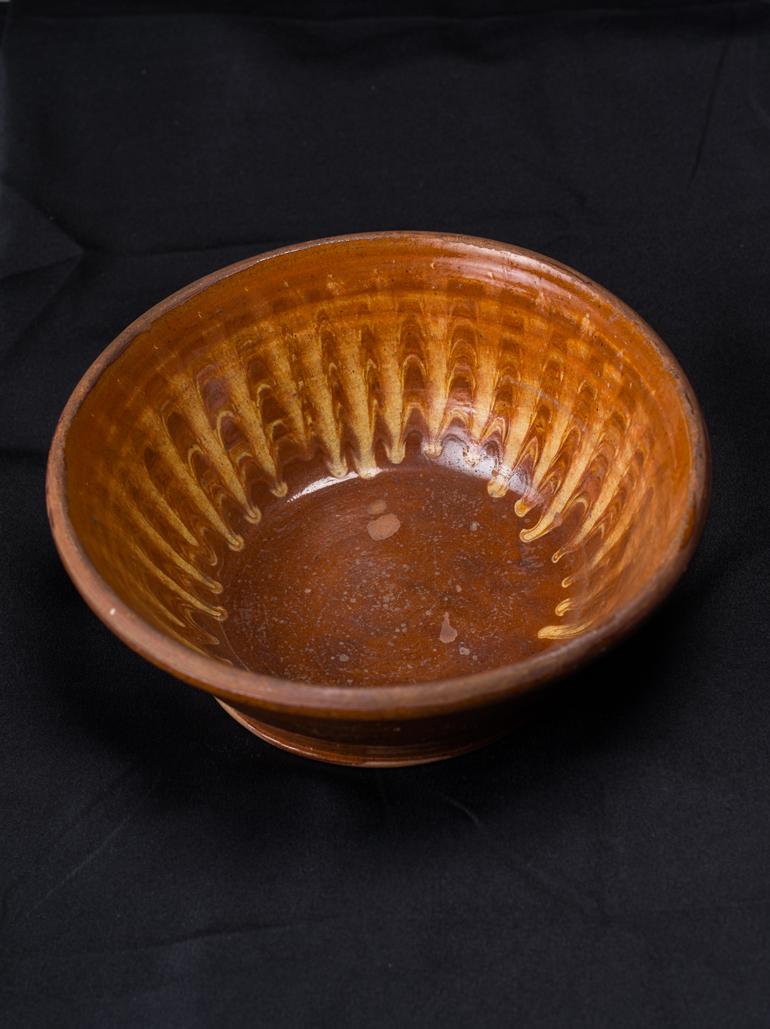 Vibrantly decorated bowl in the tradition of the Adams family potters of Hagerstown MD. Deep form with rounded rim and beaded foot. Very good condition free of chips and cracks with several glaze flakes to center and very minor wear.