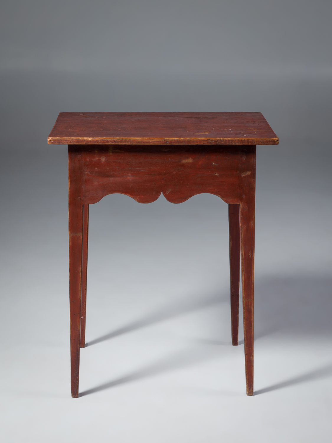 Very sturdy tea table with pegged construction throughout. Scalloped apron on all four sides, tapered legs and two-board top. Old surface with two generations of red wash; imperfections commensurate with age and use. A nice size table with a great surface.