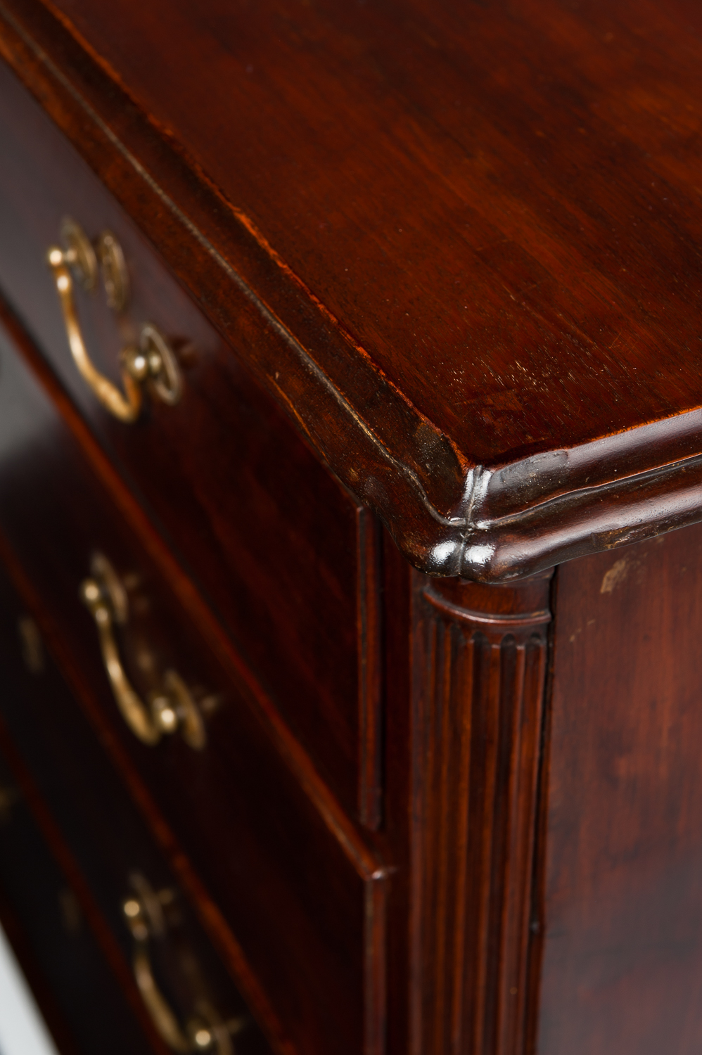 Chests of drawers like this one, with two over three graduated drawer configurations were among the staples of cabinet shops in the middle colonies. The vertical emphasis and the relatively tall ogee bracket feet can be found on chests from Virginia and Maryland in the upper regions of the Potomac River Valley and the rather provincial nature of the notched corners of the molded top suggest a rural rather than urban cabinet shop. Similarly, the full dustboards and the “neat” cabinetwork reflect predominately English cabinetmaking traditions. In combination, the characteristics reflected in this chest point to an attribution to the western regions of Maryland, possibly the Frederick area.